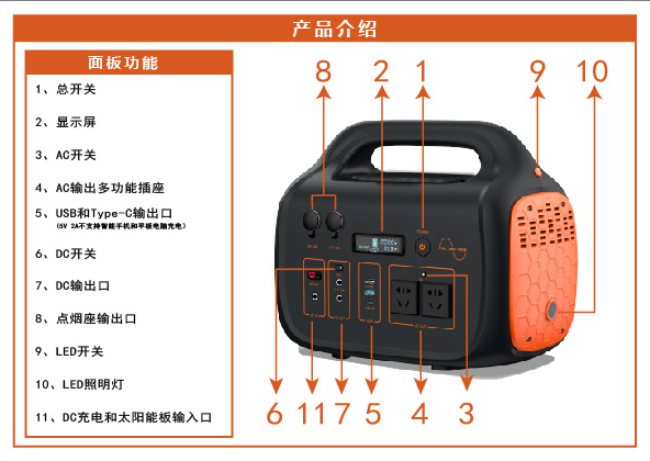 - Ia menyokong pengecasan dan nyahcas pada masa yang sama. Ia mempunyai pelbagai kegunaan. Ia boleh digunakan sebagai bekalan kuasa UPS dalam talian atau sebagai bekalan kuasa sandaran kecemasan luar. Ia boleh memenuhi peralatan perubatan dalaman, pencetak kecil, pelbagai lampu, pemanas tangki ikan kecil, buku nota, dan perkhemahan luar. Ia digunakan apabila lampu dan bekalan kuasa AC diperlukan dalam keadaan seperti fotografi, kecemasan kebakaran, penyelamatan kecemasan dan bantuan bencana.