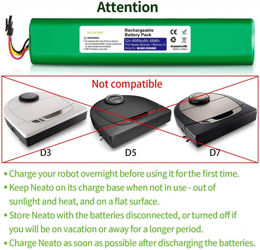 * Putuskan bateri atau matikan mesin semasa menyimpan Neato. Sila simpan sel di bawah patung separuh cas, tidak boleh dicas sepenuhnya atau dilepaskan jika penyimpanan jangka panjang.