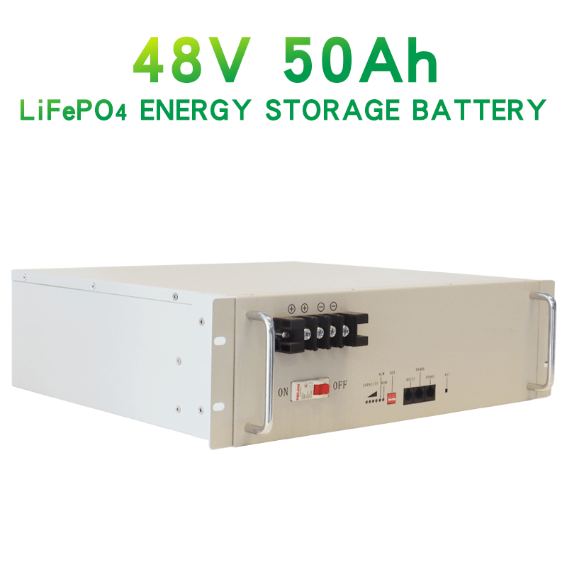 Sistem bateri 48V 50Ah LFP ini mempunyai BMS terbina dalam dan kotak keluli tahan karat yang dicat dengan warna hitam atau putih.