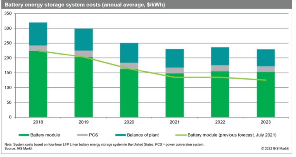 Dalam kertas putih baru-baru ini, IHS Markit meramalkan bahawa lonjakan harga bahan mentah akan menahan penurunan harga bateri EV lagi sehingga 2024. Analisis itu meramalkan bahawa purata harga bateri EV 2022 akan menjadi 5% lebih tinggi daripada pada 2021, kebanyakannya disebabkan peningkatan auto- permintaan industri untuk bateri lithium iron phosphate (LFP).